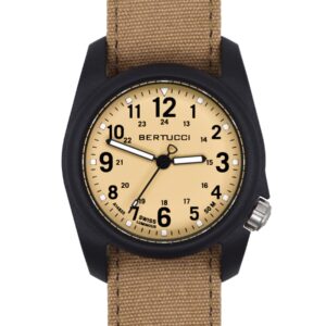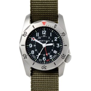 DESCRIPTION The A-2TR Vintage GMT is inspired by classic U.S. military watches. The period authentic dial is complimented by Bertucci's rugged U.S. Patented 40 mm solid titanium Unibody case. This watch has all the requisite features when it comes to delivering focused essential function… a 2nd time zone GMT feature, and date, a top quality…