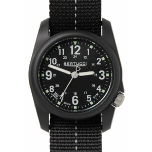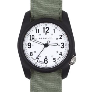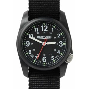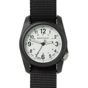 DESCRIPTION The Bertucci DX3 Field Watch offers classic design, a U.S. patented durable fiber reinforced poly-resin case, and a long list of performance features. A hardened mineral glass crystal, offset ergonomic crown, long lasting all-metal precision movement, 3 year battery life, heavy-duty DX3 Zulu B-TYPE nylon webbing band, and Swiss super luminous hands are just…