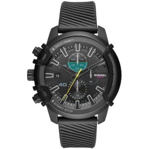DESCRIPTION This Diesel Griffed watch features a black sunray dial with gunmetal stick indexes, chronograph movement and black silicone strap.   SPECIFICATIONS Case Size: 48 mm Case Thickness: 13 mm Band Material: Silicone Band Width: 22mm Water Resistance: 5 ATM Case Material: Stainless steel Case Finish: Combo Closure/Adjustability: Single prong strap buckle Dial Color: Black…