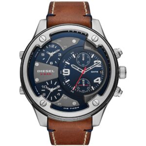 DESCRIPTION This Diesel Boltdown watch features a blue dial and two sub dials with white stick indexes and numerals, three-hand movement and brown leather strap. SPECIFICATIONS Case Size: 56 mm Case Thickness: 12 mm Band Material: Leather Band Width: 26mm Water Resistance: 3 ATM Case Material: Stainless steel Case Finish: Combo Attachment Material: Leather…