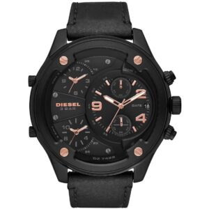 DESCRIPTION With a textured gunmetal chronograph dial, black case and tan leather strap, the Diesel Mr. Daddy 2.0 watch exudes masculine style. SPECIFICATIONS Case Size: 57 mm Case Thickness: 14 mm Water Resistance: 3 ATM Case Material: Stainless Steel Black Movement: QUARTZ/3 HAND