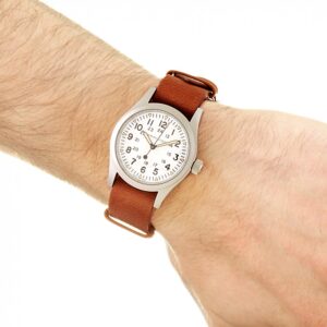 BRAND Hamilton CASE WIDTH 38.00 CASE DEPTH 9.00 MODEL NAME Khaki Field MPN H69439511 EAN 7640167049080 WATER RESISTANCE 50 metres GENDER Gents CASE MATERIAL Stainless Steel MOVEMENT Mechanical DIAL COLOUR Cream STRAP TYPE Leather strap ANALOGUE/DIGITAL Analogue CASE SHAPE Circle GLASS Sapphire WARRANTY 2 years