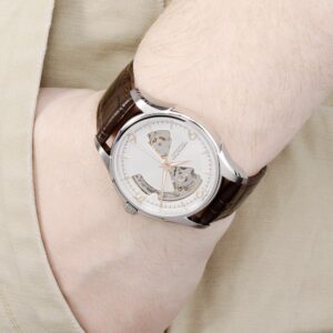BRAND Hamilton CASE WIDTH 41.00 CASE DEPTH 11.00 MODEL NAME Jazzmaster Open Heart MPN H32565555 EAN 7640127750261 WATER RESISTANCE 50 metres GENDER Gents CASE MATERIAL Stainless Steel MOVEMENT Automatic DIAL COLOUR Silver STRAP TYPE Leather strap ANALOGUE/DIGITAL Analogue CASE SHAPE Circle GLASS Sapphire STRAP COLOUR Brown WARRANTY 2 years