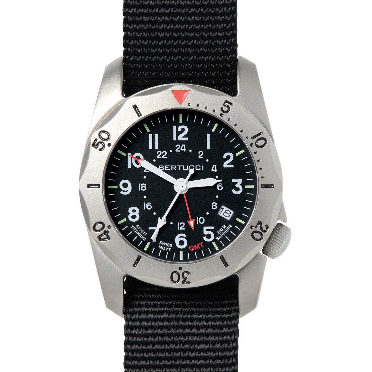 The A-2TR Vintage GMT is inspired by classic U.S. military watches. The period authentic dial is complimented by Bertucci's rugged U.S. Patented 40 mm solid titanium Unibody case. This watch has all the requisite features when it comes to delivering focused essential function… a 2nd time zone GMT feature, and date, a top quality precise & reliable Swiss made quartz movement, durable screw down crown & case back, scratch resistant sapphire crystal, and a unidirectional titanium elapsed time / directional ring.