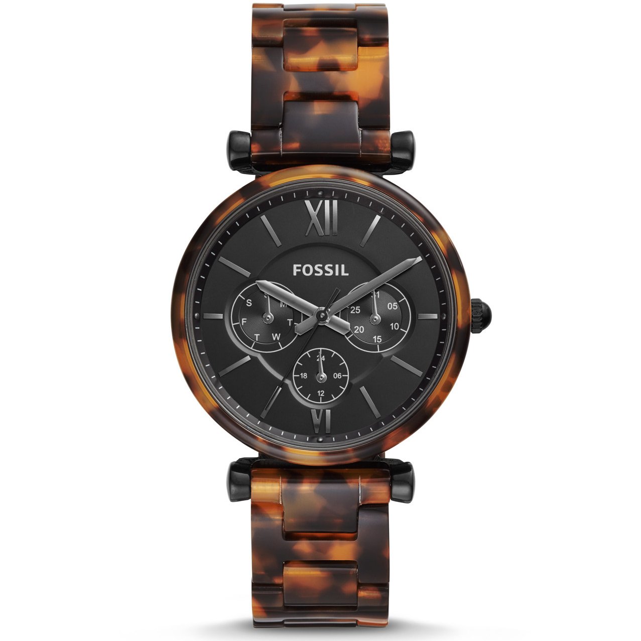 This 35mm Carlie features a black satin dial with Roman numeral and stick indices, multifunction movement and a tort acetate bracelet.