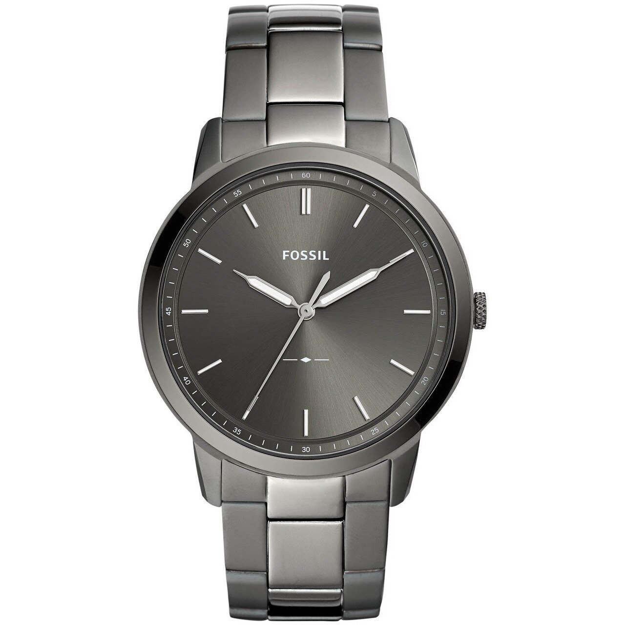 This 44mm Minimalist 3H features a gray sunray dial with stick indices, three-hand movement and smoke stainless steel bracelet.