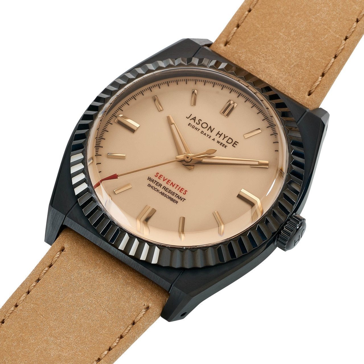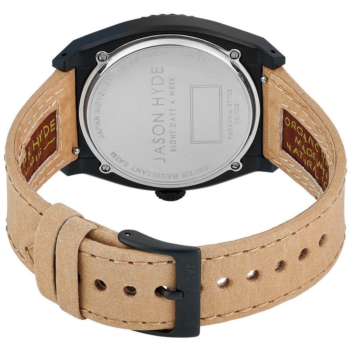 The Amber Collection for Jason Hyde includes silver dials with Amber crystal. This gives the watch a unique color combination in different lights. Seventies inspired, this simple watch is a must-have. While the strap gives the appearance of leather, it is made from recycled paper.