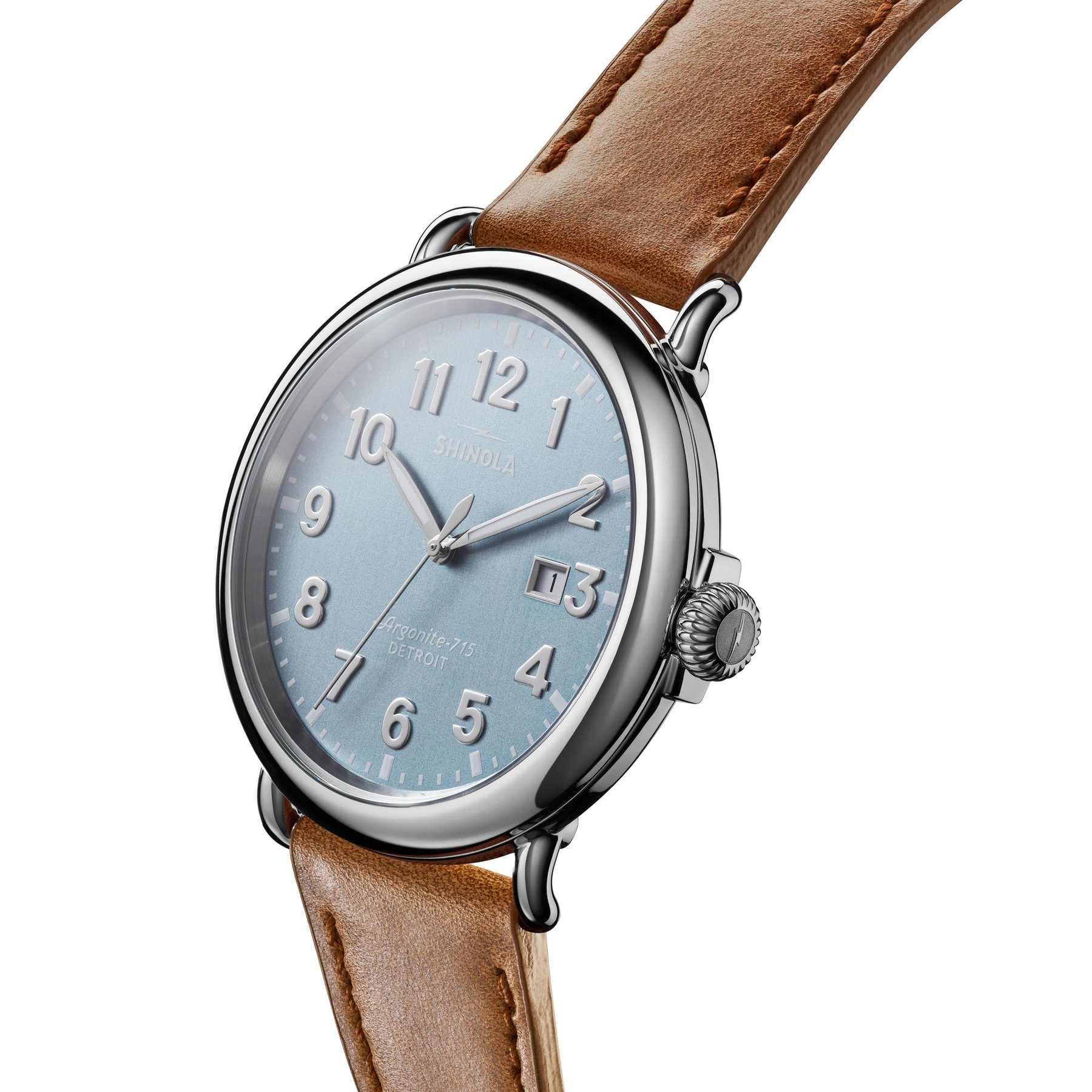 The Runwell, a Shinola original, presents itself in a cool new colorway. Built to last and named accordingly, our flagship is hand assembled in Detroit and the best choice for your next family heirloom. This 47mm timepiece features a new stone blue dial with a vertical brushed finish, polished stainless steel case and premium leather strap in largo tan.