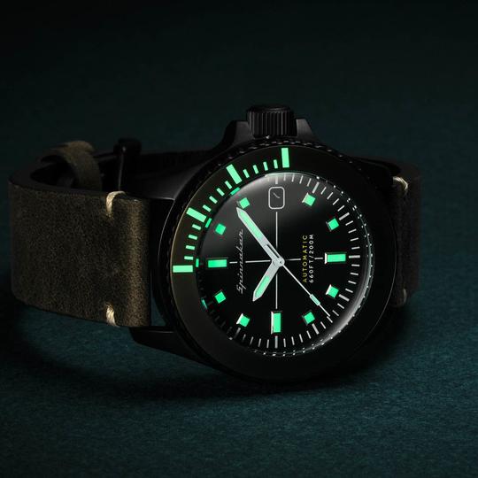 The Drab edition of the Spence utilizes a color palette that creates a more tactical stealth look and feel to this every day wear diver watch from Spinnaker. The dial of the new Drab edition Spence takes a more minimalistic approach to its layout.