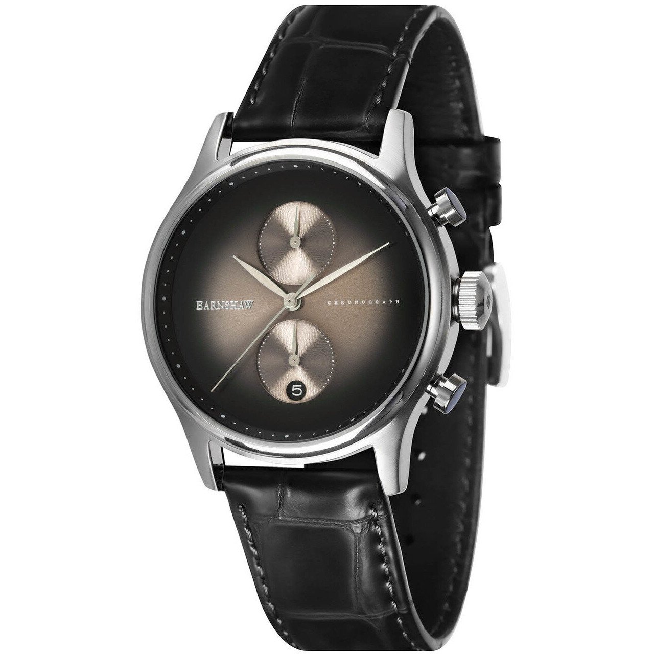 ES 8094 Bauer Fumee chronograph The smoky mystery of the Fumee dial comes alive with this elegant timepiece. With a subdued, minimalistic dial, the watch is a sophisticated expression of the Earnshaw brand. A 43mm fluidly round case with polished bezel frames the dial face with cleanly cut leaf shaped hour and minute hands adding perfect balance and weight. Piston like pushers operate the chronograph without adding too much weight or heft to the case to retain a more graceful feel. A genuine leather strap that attaches to the case combines perfectly to complete a symphony of detail and finishing on this subtly remarkable timepiece.