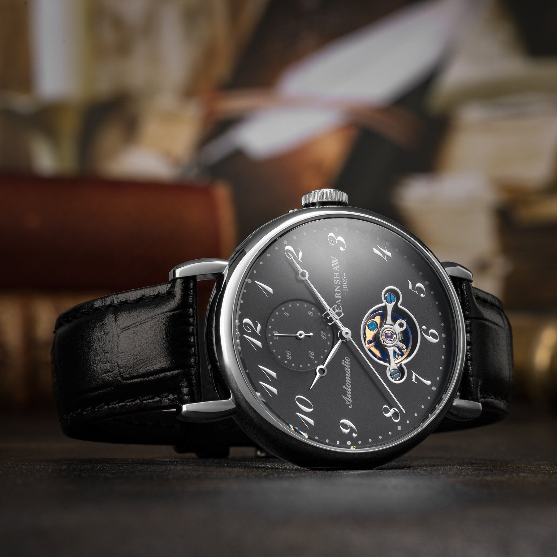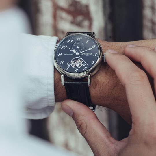 The Grand Legacy continues a tradition of elegant, timepieces from the Earnshaw brand. Featuring a 41mm diameter solid stainless steel case with exhibition caseback and sapphire coated hardened mineral lens, the watch wears comfortably and snug to the wrist. With flared lugs, the watch strikes a more antique inspired silhouette. On the dial, Breguet style hands are perfectly balanced and add style and a matured sophistication. Italicized Arabic numbers mark out the hours with a 24hour subdial and open heart display laying across the dials 12-6 hour axis.