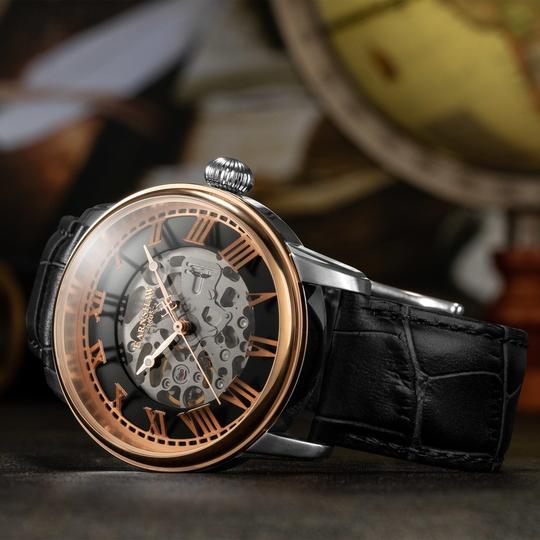 While the hour markers are all true Roman Numerals owing to their position and placement they become at time more subtle when viewed in one angle to once again fully on display when shown at another. A raised hardened mineral lens covers this raised index but the watch nonetheless retains an elegant eminently wearable profile. Powered by the Japanese made Skeleton automatic movement the watch is also a reliable, wearable timepiece that is utterly yet subtly unique.