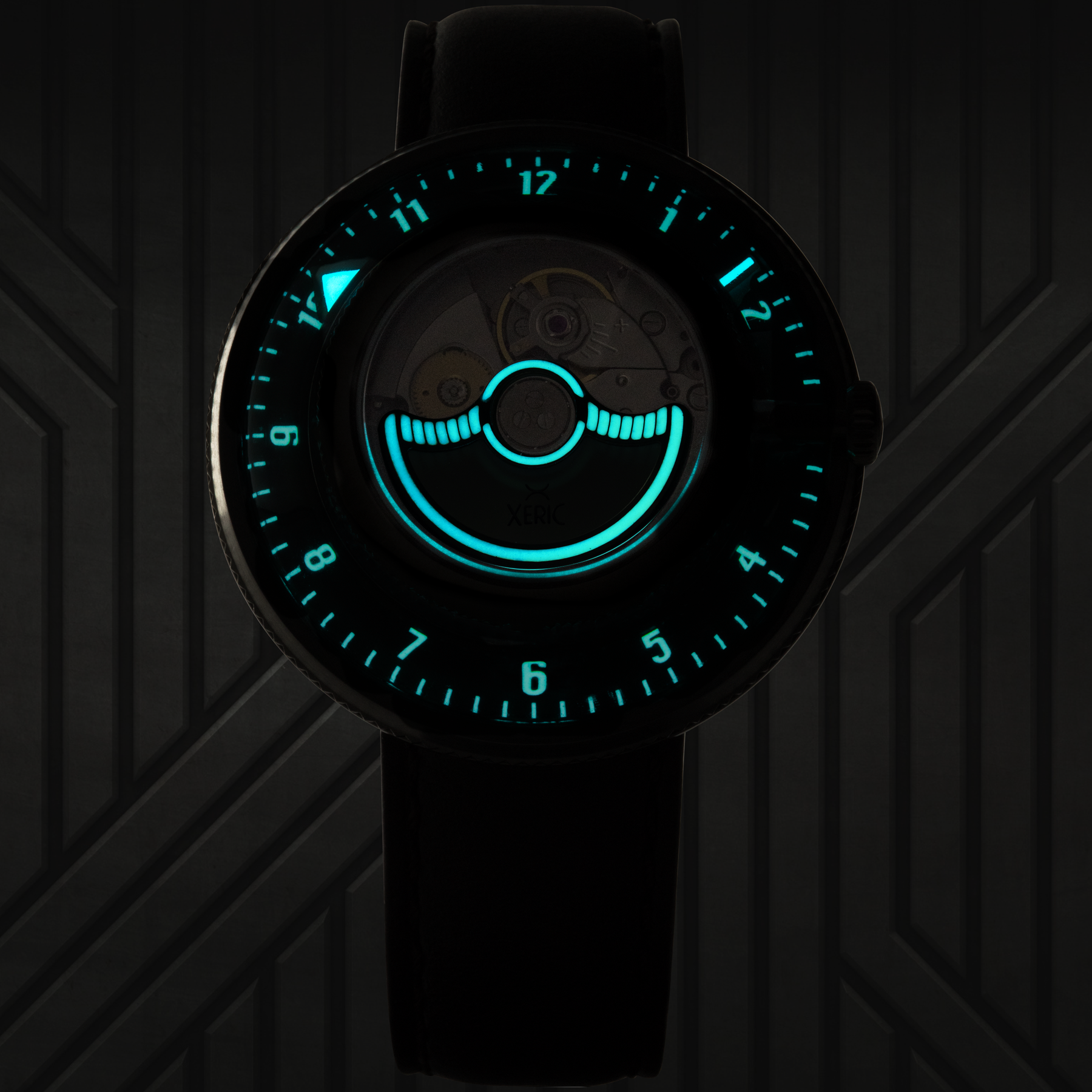 In order to create the Invertor, Xeric developed a new proprietary module for the Miyota 9000 calibre automatic movement. The module mechanically makes the watch run backwards, but when the movement is positioned in the case upside down, time reads correctly.